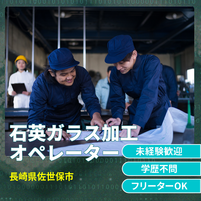 給与詳細 月収例 240,000円 日給例 12,000円 勤務地 長崎県佐世保市 仕事内容 石英ガラスの加工機械オペレーター、他付随する作業。