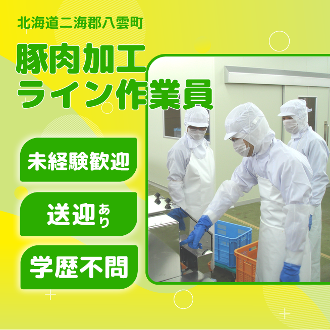 豚肉の食品加工処理(刃物不使用)に携わるライン業務です。