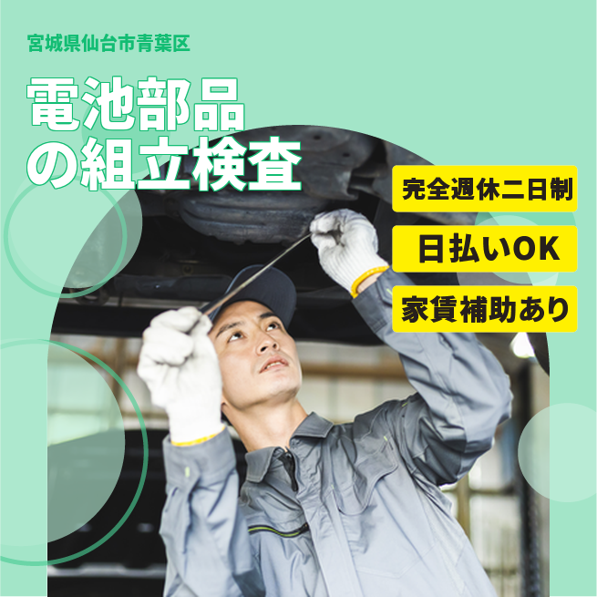 給与詳細 月収例 238,000円 日給例 11,200円 勤務地 宮城県仙台市青葉区 仕事内容 ①職場:製造一ショップ・組立工程