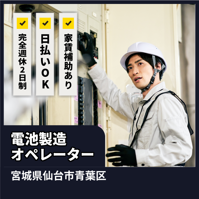 給与詳細 月収例 238,000円 日給例 11,200円 勤務地 宮城県仙台市青葉区 仕事内容 【業務内容】二次電池の組立業務