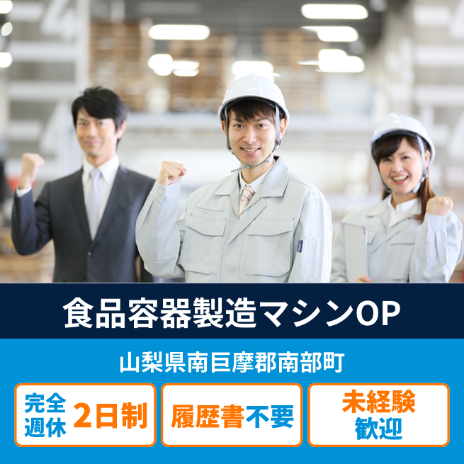 給与詳細 月収例 260,000円 時給例 1,620円 勤務地 山梨県南巨摩郡南部町 仕事内容 原料を機械に投入して