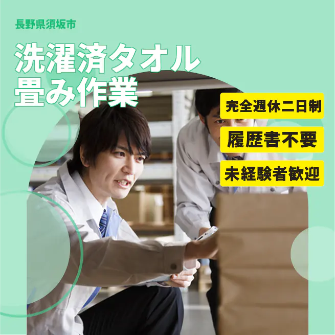 給与詳細 月収例 140,000円 時給例 1,200円 勤務地 長野県須坂市 仕事内容 【業務内容】洗濯済みのタオルやシーツを畳む作業