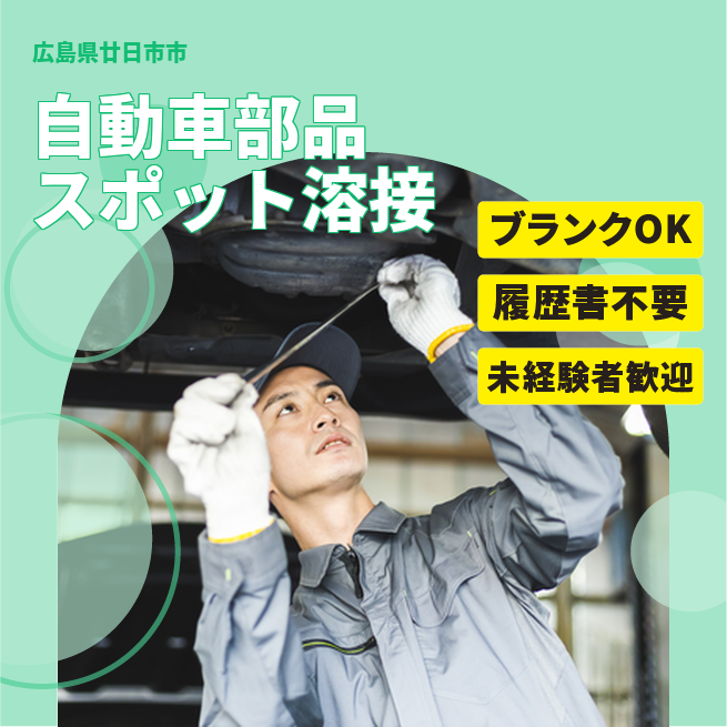給与詳細 月収例 255,000円 日給例 12,750円 勤務地 広島県廿日市市 仕事内容 工場内での作業・スポット溶接機を使って、ボルトのスポット溶接作業(自動車部品)・ロボット作業(必要な部品をロボットにセットします)