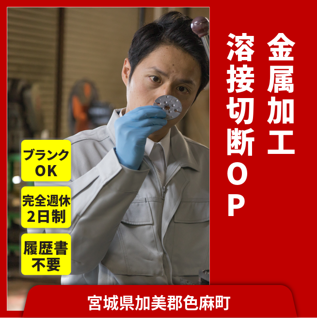 給与詳細 月収例 208,000円 日給例 10,400円 勤務地 宮城県加美郡色麻町 仕事内容 溶接、切断などの金属加工オペレーター業務です。