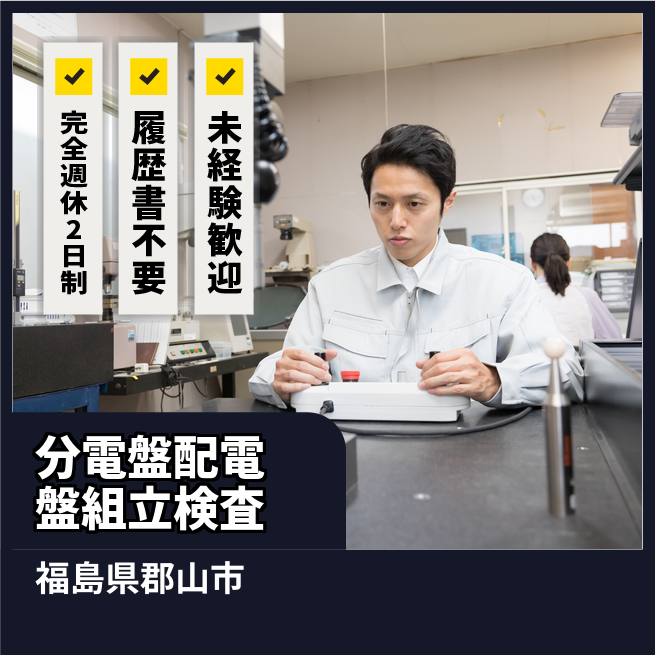 給与詳細 月収例 273,000円 日給例 11,200円 勤務地 福島県郡山市 仕事内容 住居や商業用施設などで使われている分電盤・配電盤を図面を見て組立をしたり、それに使われる銅線を切断機で加工する作業