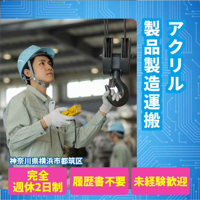 給与詳細 月収例 210,000円 日給例 10,500円 勤務地 神奈川県横浜市都筑区 仕事内容 アクリル樹脂製品の運搬、検査、薬品投入業務。アクリル製品の製造ラインでアクリルの原料(液体)をセットした2枚組のガラス(1m×1mが主)を2名でラックに積んでいく作業とラックを炉まで運搬する作業。