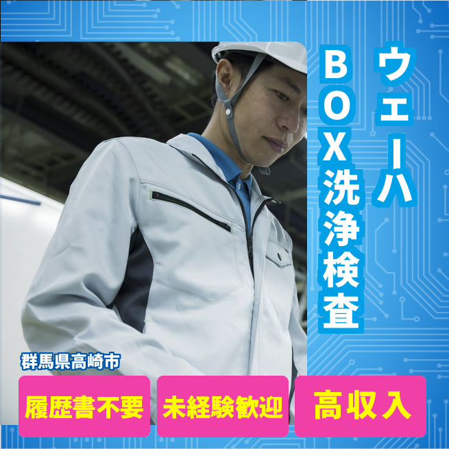 給与詳細 月収例 282,750円 日給例 11,600円 勤務地 群馬県高崎市 仕事内容 シリコンウェーハを入れる収納BOXの洗浄・検品