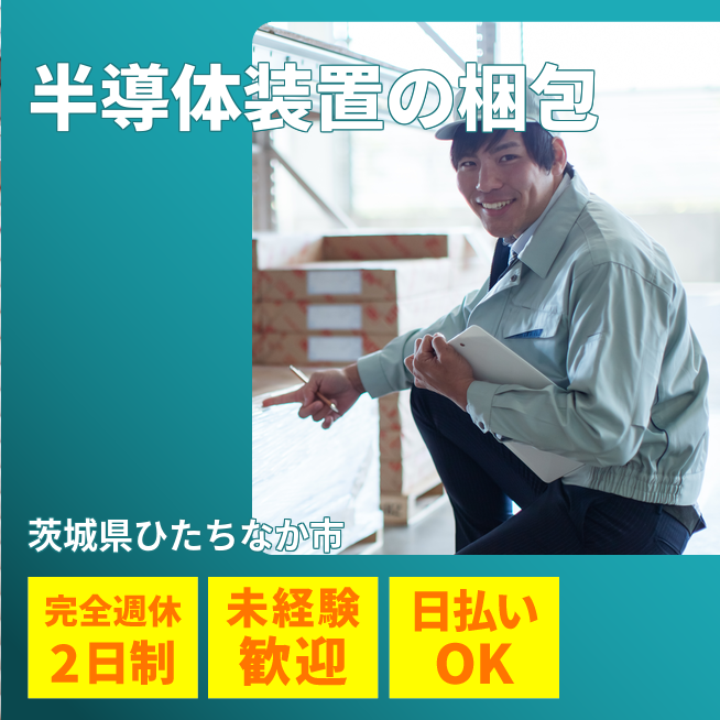 ①【業務内容】…半導体検査製品の梱包作業 製品本体(3,000~3,500kg前後)その他装置(300㎏~800㎏)の木箱梱包。電動工具(インパクトドライバー)を使用してボルト等での封緘、アイロン、ブロアーを使用してヒートシール(熱圧着)輸出用ラベル(出荷帳票)貼り、空の梱包箱および梱包完成箱の場内運搬(ハンドリフトを使用)