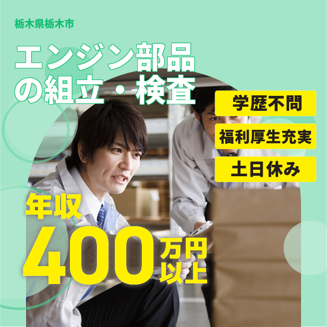 給与詳細 月収例 248,000円 日給例 12,400円 勤務地 栃木県栃木市 仕事内容 自動車エンジン部品の組立、加工ライン、出来上がった製品の検査、ピッキング作業など。部品加工は機械にセットする作業がメインになります。いずれかの工程を専任してもらいます。適正に合わせて配属が決まります。
