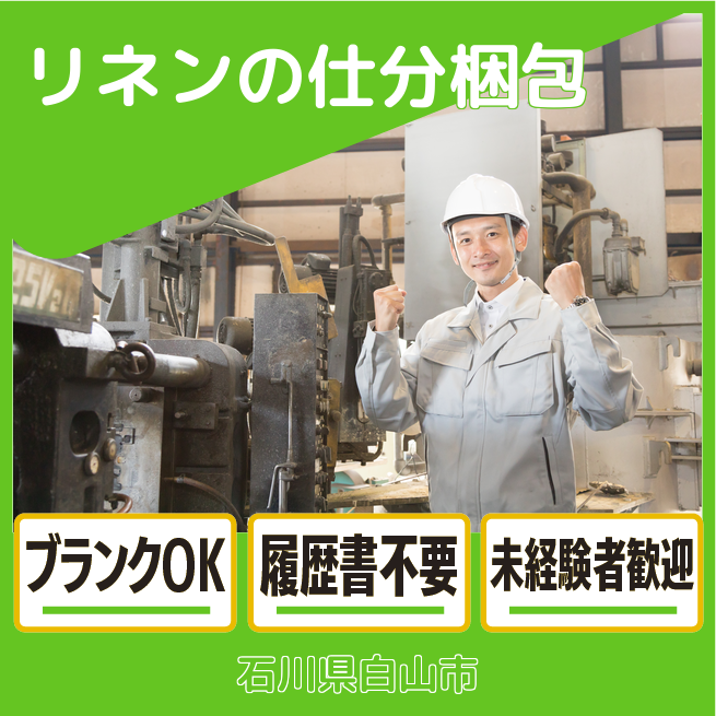 給与詳細 月収例 220,000円 日給例 11,000円 勤務地 石川県白山市 仕事内容 洗浄部門より運搬されてきたタオルやシーツを出荷できるように仕分け・梱包・運搬をするお仕事です。