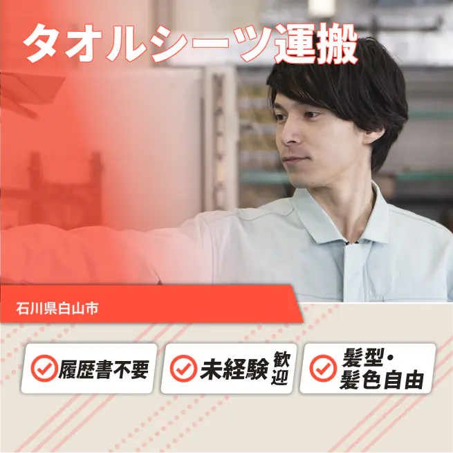 給与詳細 月収例 220,000円 日給例 11,000円 勤務地 石川県白山市 仕事内容 【業務内容】タオルやシーツの仕分け・梱包・運搬を行う仕事