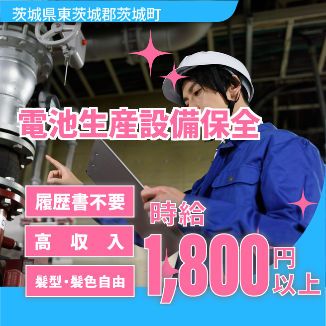 給与詳細 月収例 300,000円 時給例 1,850円 勤務地 茨城県東茨城郡茨城町 仕事内容 【業務内容】電気自動車用リチウムイオン電池生産設備の保全業務