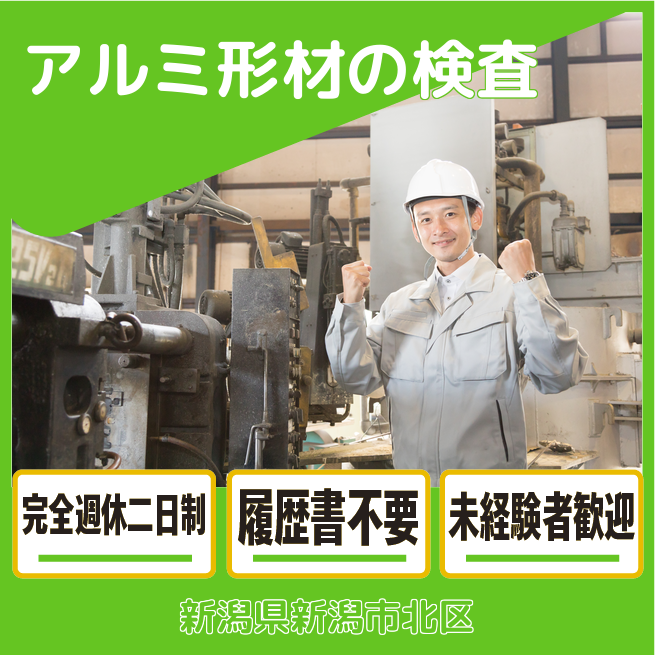 給与詳細 月収例 200,000円 日給例 10,000円 勤務地 新潟県新潟市北区 仕事内容 アルミ形材の検査(寸法・外観等)、アルミ試験片の試験(引張り、硬度等)、記録、その付随業務。大手企業、アクティブに働きたい方にオススメです!