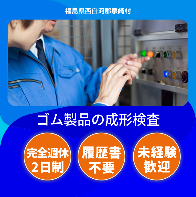 給与詳細 月収例 234,000円 時給例 1,200円 勤務地 福島県西白河郡泉崎村 仕事内容 スポーツ用品や車載器に使われるゴム製品を作っています。