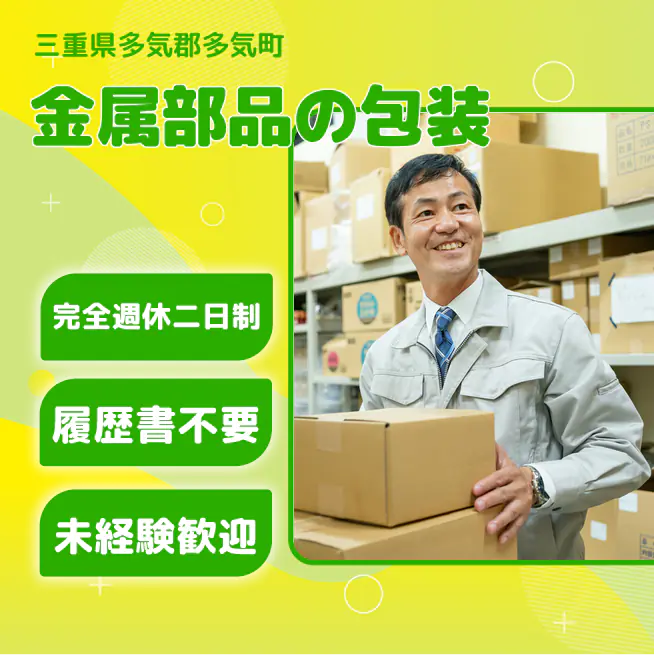 給与詳細 月収例 234,000円 時給例 1,200円 勤務地 三重県多気郡多気町 仕事内容 【業務内容】金属部品の梱包と出荷作業を担当します。