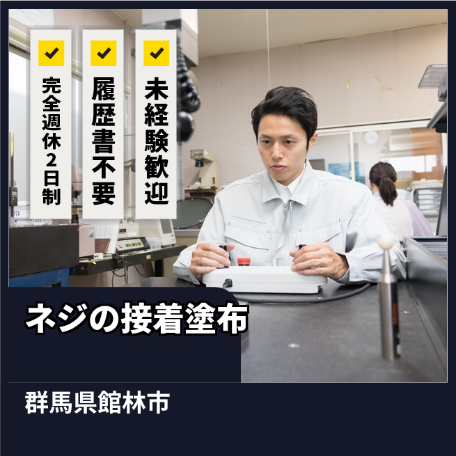 給与詳細 月収例 243,750円 日給例 10,000円 勤務地 群馬県館林市 仕事内容 ボルト・ネジへの接着剤の塗布作業