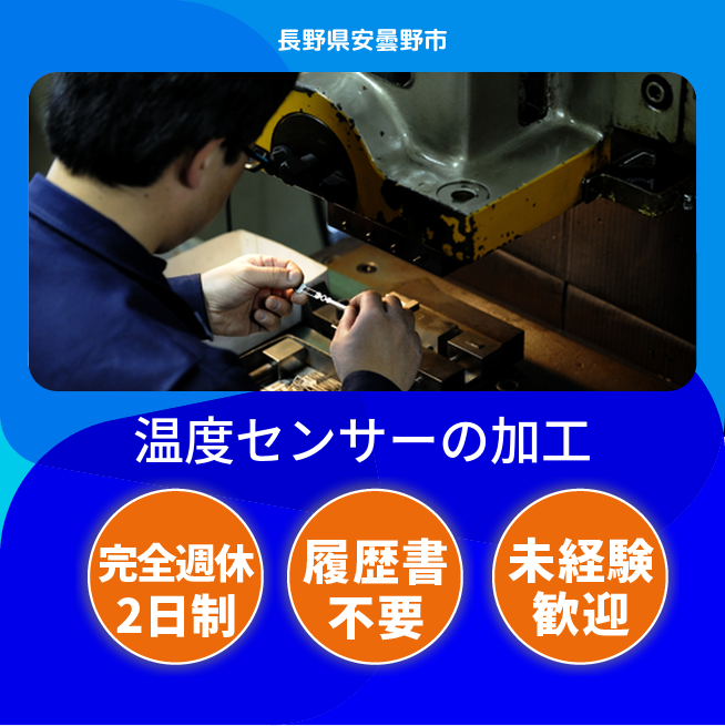 給与詳細 月収例 253,500円 日給例 10,400円 勤務地 長野県安曇野市 仕事内容 産業用機械の中に入る温度センサーを扱います。細いガラス管の中に、金属線を通したり、ガラス管を溶接しながら加工、図面を見ながら配線・加工をします。作業台も通常より高めに設定されており体に負担のないように配慮した職場です。