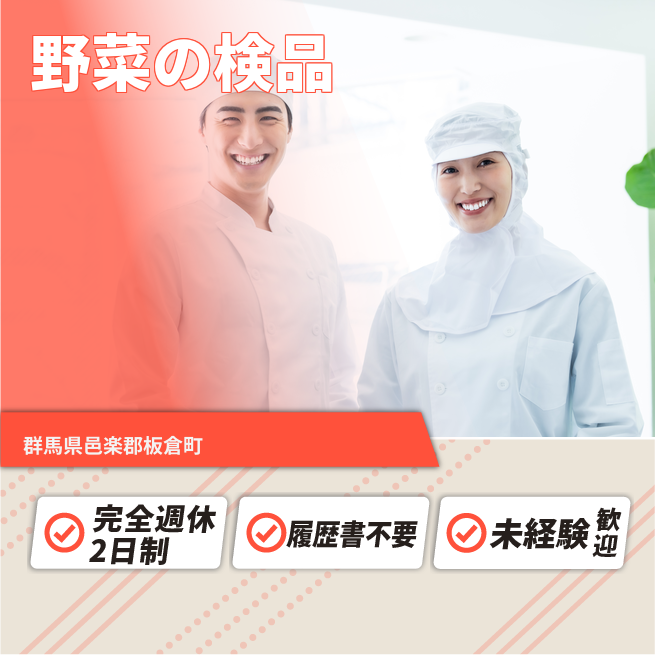 給与詳細 月収例 253,500円 日給例 10,400円 勤務地 群馬県邑楽郡板倉町 仕事内容 入荷した野菜の目視検品、傷や痛みがないか確認。
