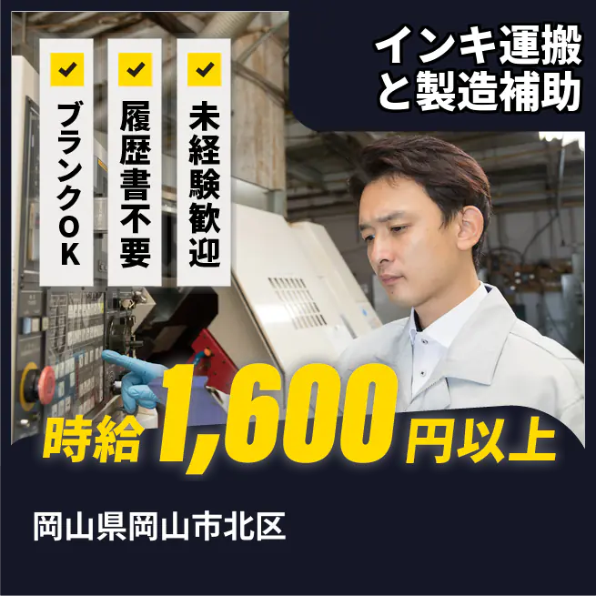 給与詳細 年収例 4,095,000円 月収例 341,250円 勤務地 岡山県岡山市北区 仕事内容 【業務内容】フィルム製品用インキの運搬と製造補助