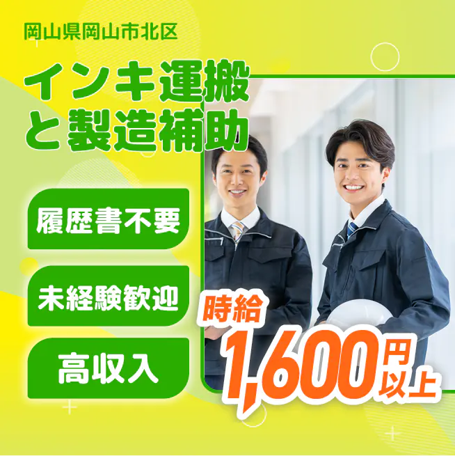 給与詳細 年収例 4,095,000円 月収例 341,250円 勤務地 岡山県岡山市北区 仕事内容 【業務内容】フィルム製品用インキの運搬と製造補助