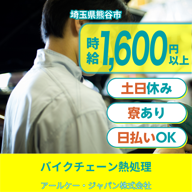 バイク用チェーンの熱処理加工を行うお仕事です。機械操作と製品運搬が中心の作業です。