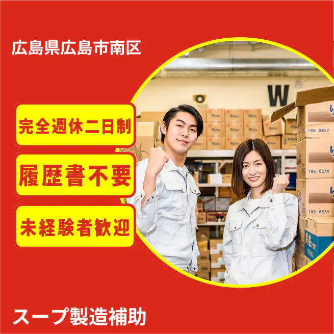 給与詳細 月収例 220,000円 日給例 11,000円 勤務地 広島県広島市南区 仕事内容 【業務内容】ラーメンスープ製造の機械オペレーションとライン補助業務
