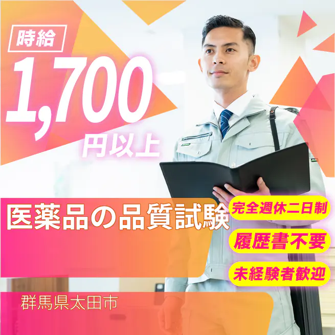 給与詳細 月収例 255,000円 時給例 1,700円 勤務地 群馬県太田市 仕事内容 【業務内容】