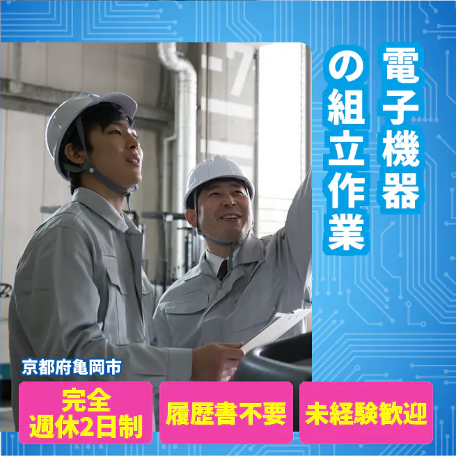 給与詳細 月収例 247,650円 日給例 10,160円 勤務地 京都府亀岡市 仕事内容 【業務内容】電子機器の検査や組立、梱包作業