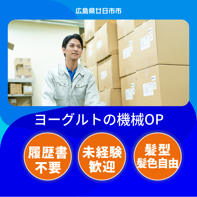 給与詳細 月収例 210,000円 日給例 10,500円 勤務地 広島県廿日市市 仕事内容 ヨーグルト製造工場での充填機と包装機の機械オペレータ