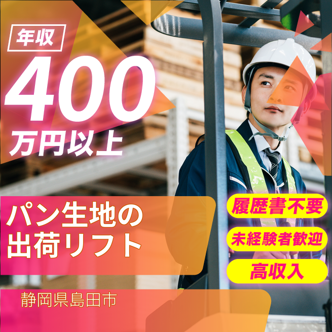 給与詳細 月収例 260,000円 日給例 13,000円 勤務地 静岡県島田市 仕事内容 倉庫内で製品をフォークリフトで運搬する作業、冷凍パン生地の出荷、搬入、棚卸、箱詰め作業です。専用端末使用によるパソコン操作、その他生産に携わる業務を行っていただきます。