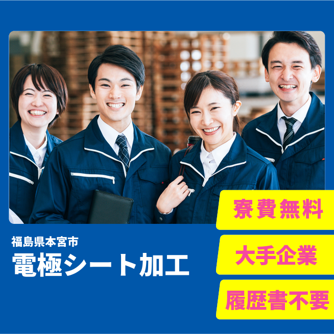 給与詳細 月収例 250,000円 日給例 12,500円 勤務地 福島県本宮市 仕事内容 【業務内容】電極シートの製造工程に携わる作業