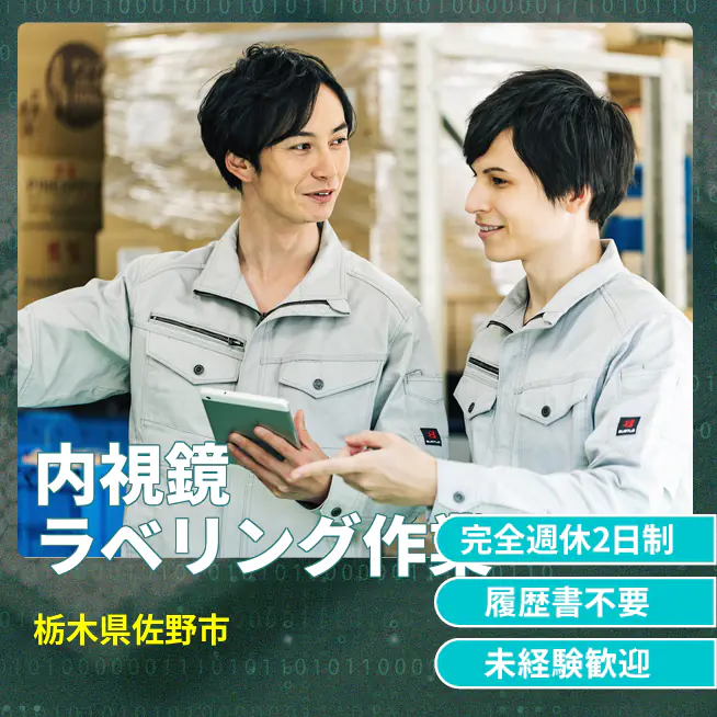 給与詳細 月収例 192,000円 時給例 1,200円 勤務地 栃木県佐野市 仕事内容 【業務内容】クリーンルーム内での内視鏡のラベリング、検査、組立作業