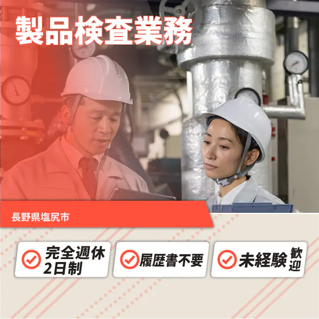 給与詳細 月収例 160,000円 時給例 1,250円 勤務地 長野県塩尻市 仕事内容 【業務内容】検査装置を使用して、製品の品質を確認します。
