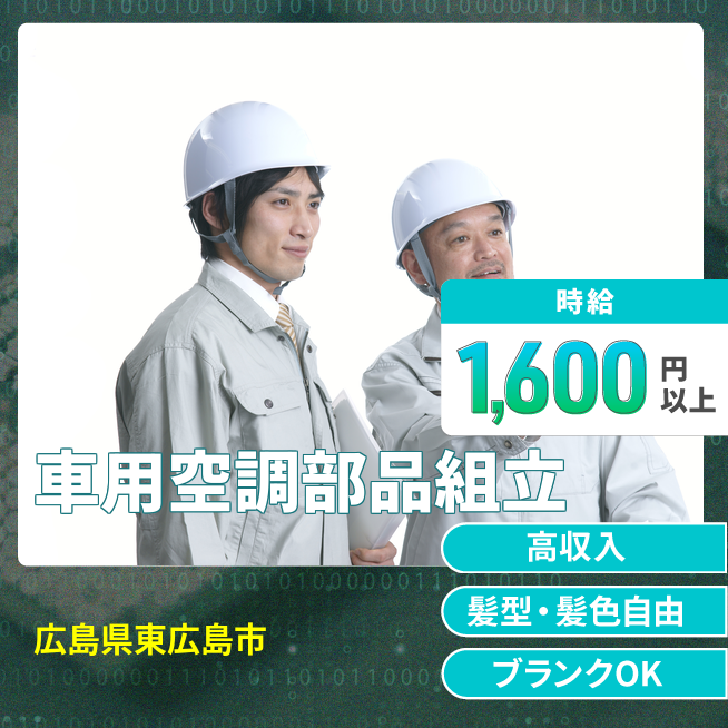 給与詳細 年収例 4,680,000円 月収例 390,000円 勤務地 広島県東広島市 仕事内容 自動車に使用される空調・冷却部品の製造業務です。
