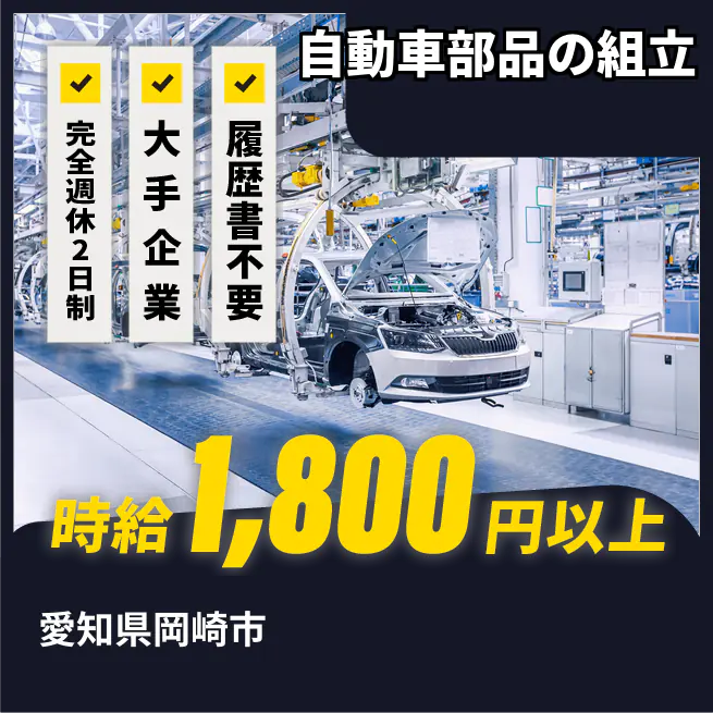 給与詳細 年収例 4,200,000円 月収例 350,000円 勤務地 愛知県岡崎市 仕事内容 【業務内容】自動車電子部品の組立・検査及び設備の操作