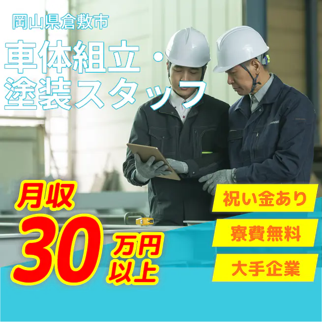 給与詳細 月収例 315,580円 日給例 12,350円 勤務地 岡山県倉敷市 仕事内容 【業務内容】