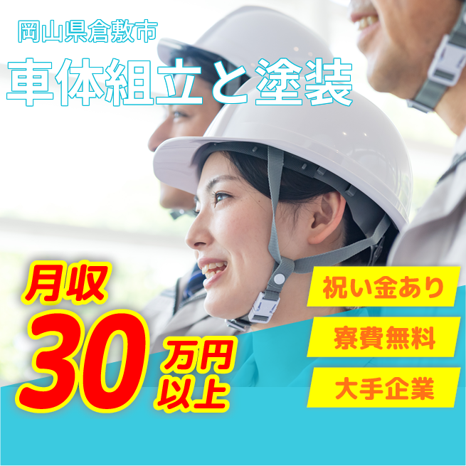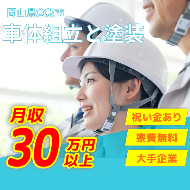 給与詳細 月収例 315,580円 日給例 12,350円 勤務地 岡山県倉敷市 仕事内容 【業務内容】 自動車製造に関わる組立、塗装、部材の運搬業務