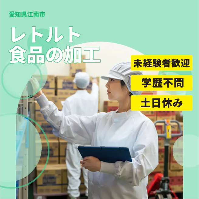 給与詳細 月収例 247,830円 日給例 10,741円 勤務地 愛知県江南市 仕事内容 【業務内容】レトルト食品の製造と検査を行います