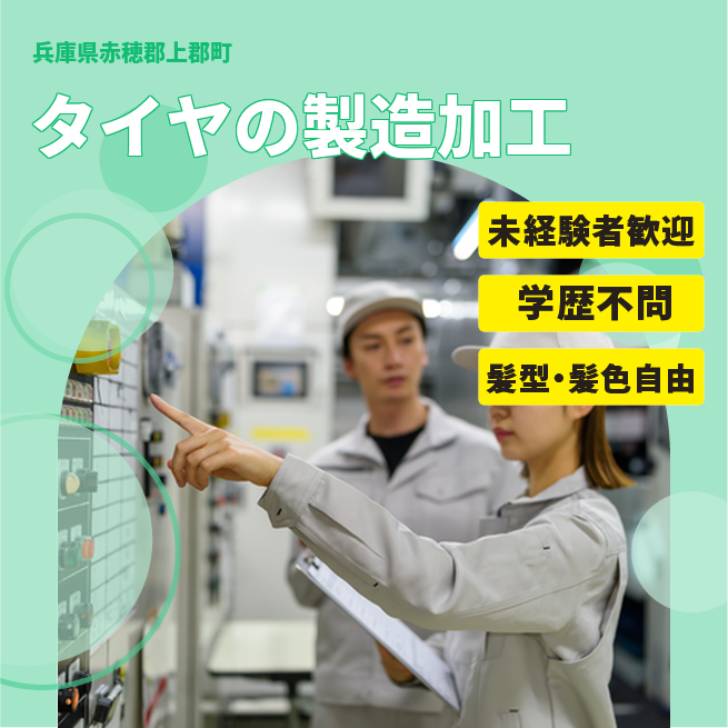 給与詳細 月収例 255,721円 日給例 10,900円 勤務地 兵庫県加古川市 仕事内容 【大型タイヤの製造】・タイヤの元を機械で練りこんで、型を付ける。