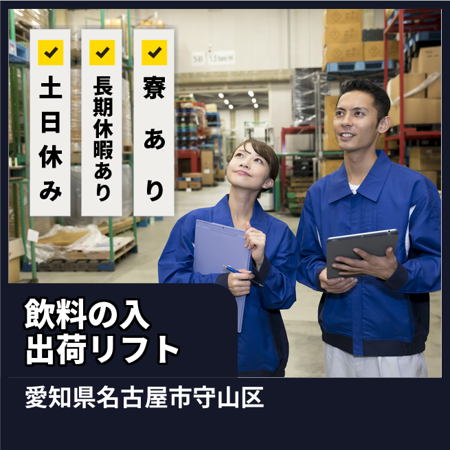 給与詳細 月収例 258,546円 日給例 10,648円 勤務地 愛知県名古屋市守山区 仕事内容 飲料の入出荷業務