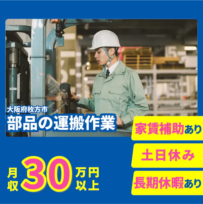 給与詳細 月収例 305,812円 日給例 11,650円 勤務地 大阪府枚方市 仕事内容 フォークリフトを使用し部品の運搬を行います。