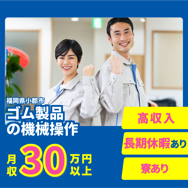 給与詳細 月収例 300,417円 時給例 1,625円 勤務地 福岡県朝倉市 仕事内容 機械にゴムの材料を投入して、製品を製作します。