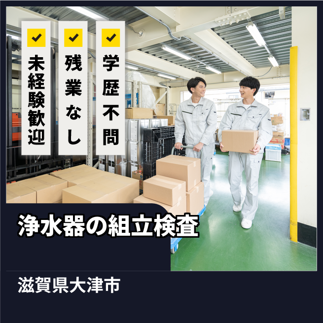 給与詳細 月収例 161,700円 時給例 1,100円 勤務地 滋賀県大津市 仕事内容 浄水器の製造。