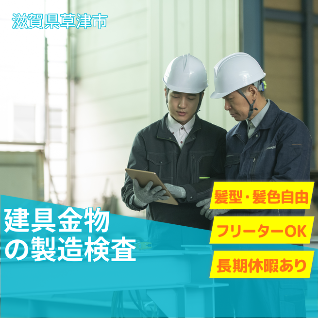 ①建築金物(窓枠など)の製造やプレス加工・樹脂成型作業(機械オペレーター)②内装建具(ドアの取ってなど)の加工及び組立作業(工具使用)③加工後の製品の目視による外観検査・梱包作業。 適性をみて工程の配置が決まりますのでご安心ください。