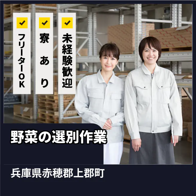 給与詳細 月収例 190,125円 日給例 10,400円 勤務地 兵庫県宍粟市 仕事内容 原料となる野菜(白菜、大根、人参)をベルトコンベヤへ並べていく作業を主に行っていただきます。