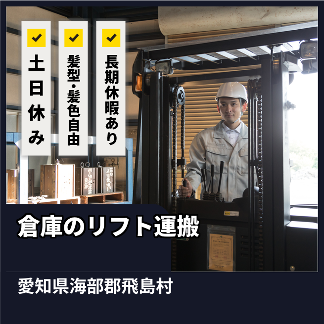 給与詳細 月収例 253,450円 日給例 10,960円 勤務地 愛知県海部郡飛島村 仕事内容 フォークリフトを使用しての運搬作業