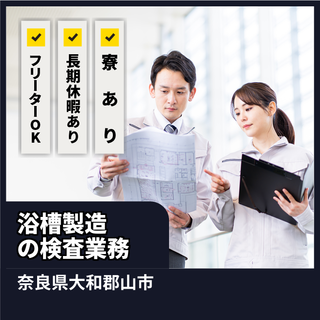 給与詳細 月収例 261,731円 日給例 10,800円 勤務地 奈良県大和郡山市 仕事内容 【業務内容】浴槽の製造工程を担当します