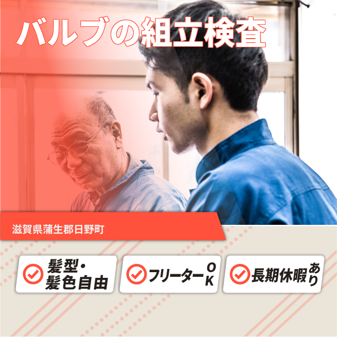【仕事内容】バルブの組立(作業台の上で部品を取り付けます 電動ドライバー使用)目視検査 梱包などを行います。