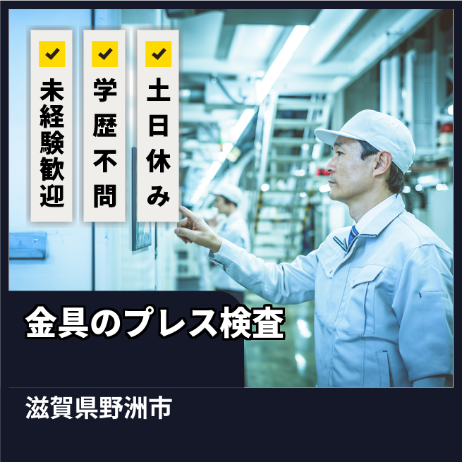 給与詳細 月収例 306,375円 日給例 12,000円 勤務地 滋賀県野洲市 仕事内容 自動車用ねじや金具(ワッシャー)を製造する工場にて、➀金属素材をプレス機械にセットする作業②プレス後のワッシャーを箱がいっぱいになったものをパレットに積み替える作業③ワッシャーに不良がないか目視検査する作業 ⑤製品を梱包する作業 をメインで行っていただきます。