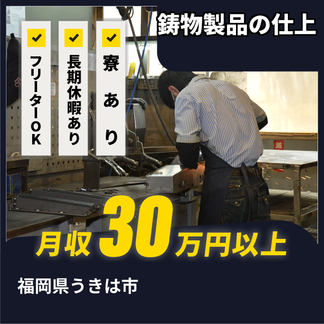 給与詳細 月収例 311,250円 日給例 12,000円 勤務地 福岡県うきは市 仕事内容 鋳物の金属製品(バルブなど)の。